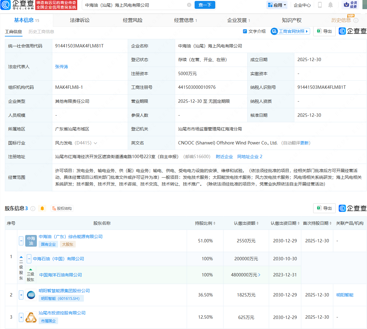近日,中海油(汕尾)海上风电有限公司成立,法定代表人张传涛,注册资本为5000万元,经营范围包含:发电业务、输电业务、供(配)电业务;发电技术服务;太阳能发电技术服务;风力发电技术服务等。企查查股权穿透显示,该公司由中国海油(600938)旗下中海油(广东)综合能源有限公司、明阳智能(601615)、汕尾市投资控股有限公司共同持股。